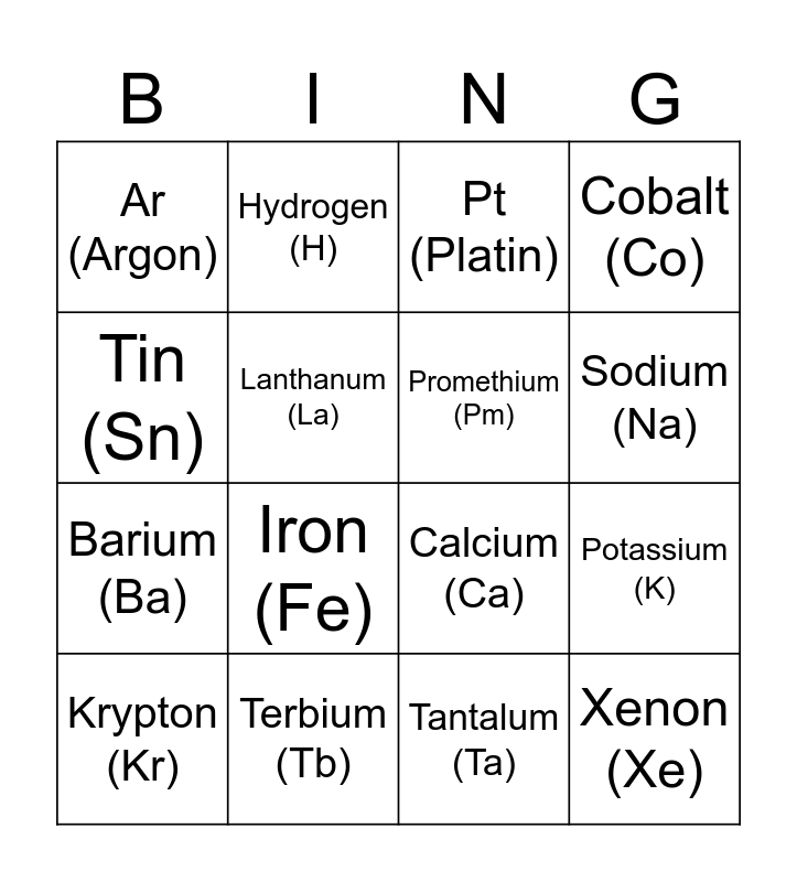 This bingo card has 99 words: Fe (Eisen), Au (Gold), Ti (Titan), Pt (Platin), Cd (Cadmium), Zn (Zink), Al (Aluminium), H (Wasserstoff), He (Helium), C (Kohlenstoff), I (Iod), Cl (Chlor), Ag (Silber), Co (Cobalt), Cr (Chrom), Ar (Argon), Hydrogen (H), Helium (He), Lithium (Li), Beryllium (Be), Boron (B), Carbon (C), Nitrogen (N), Oxygen (O), Fluorine (F), Neon (Ne), Sodium (Na), Magnesium (Mg), Aluminum (Al), Silicon (Si), Phosphorus (P), Sulfur (S), Chlorine (Cl), Argon (Ar), Potassium (K), Calcium (Ca), Scandium (Sc), Titanium (Ti), Vanadium (V), Chromium (Cr), Manganese (Mn), Iron (Fe), Cobalt (Co), Nickel (Ni), Copper (Cu), Zinc (Zn), Gallium (Ga), Germanium (Ge), Arsenic (As), Selenium (Se), Bromine (Br), Krypton (Kr), Rubidium (Rb), Strontium (Sr), Yttrium (Y), Zirconium (Zr), Niobium (Nb), Molybdenum (Mo), Technetium (Tc), Ruthenium (Ru), Rhodium (Rh), Palladium (Pd), Silver (Ag), Cadmium (Cd), Indium (In), Tin (Sn), Antimony (Sb), Tellurium (Te), Iodine (I), Xenon (Xe), Cesium (Cs), Barium (Ba), Lanthanum (La), Cerium (Ce), Praseodymium (Pr), Neodymium (Nd), Promethium (Pm), Samarium (Sm), Europium (Eu), Gadolinium (Gd), Terbium (Tb), Dysprosium (Dy), Holmium (Ho), Erbium (Er), Thulium (Tm), Ytterbium (Yb), Lutetium (Lu), Hafnium (Hf), Tantalum (Ta), Tungsten (W), Rhenium (Re), Osmium (Os), Iridium (Ir), Platinum (Pt), Gold (Au), Mercury (Hg), Thallium (Tl), Lead (Pb) and Bismuth (Bi).