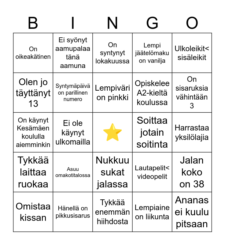 This bingo card has a free space and 24 words: Omistaa kissan, Asuu omakotitalossa, Lempiväri on pinkki, Lempiaine on liikunta, Ulkoleikit< sisäleikit, On oikeakätinen, Ei syönyt aamupalaa tänä aamuna, On syntynyt lokakuussa, Soittaa jotain soitinta, Harrastaa yksilölajia, On käynyt Kesämäen koululla aiemminkin, Syntymäpäivä on parillinen numero, Lautapelit< videopelit, Jalan koko on 38, Olen jo täyttänyt 13, Hänellä on pikkusisarus, Tykkää enemmän hiihdosta, Lempi jäätelömaku on vanilja, On sisaruksia vähintään 3, Tykkää laittaa ruokaa, Ei ole käynyt ulkomailla, Nukkuu sukat jalassa, Opiskelee A2-kieltä koulussa and Ananas ei kuulu pitsaan.