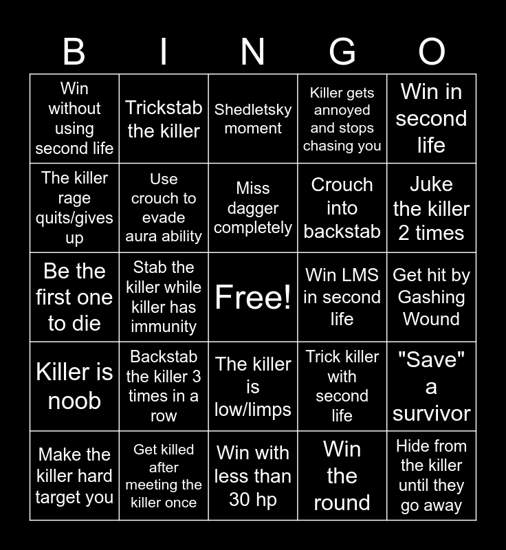 This bingo card has a free space and 24 words: Backstab the killer 3 times in a row, Get killed after meeting the killer once, Miss dagger completely, Make the killer hard target you, Win in second life, Win without using second life, The killer rage quits/gives up, Trickstab the killer, Win LMS in second life, The killer is low/limps, Crouch into backstab, Be the first one to die, Trick killer with second life, "Save" a survivor, Use crouch to evade aura ability, Win the round, Get hit by Gashing Wound, Shedletsky moment, Juke the killer 2 times, Stab the killer while killer has immunity, Hide from the killer until they go away, Killer is noob, Killer gets annoyed and stops chasing you and Win with less than 30 hp.