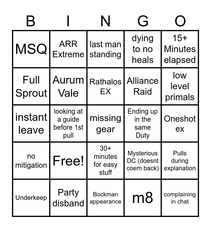 This bingo card has 25 words: Free!, Bockman appearance, Rathalos EX, Underkeep, 15+ Minutes elapsed, MSQ, Full Sprout, ARR Extreme, Ending up in the same Duty, 30+ minutes for easy stuff, Alliance Raid, instant leave, Mysterious DC (doesnt coem back), Pulls during explanation, Aurum Vale, complaining in chat, Oneshot ex, last man standing, low level primals, looking at a guide before 1st pull, missing gear, Party disband, no mitigation, dying to no heals and m8.