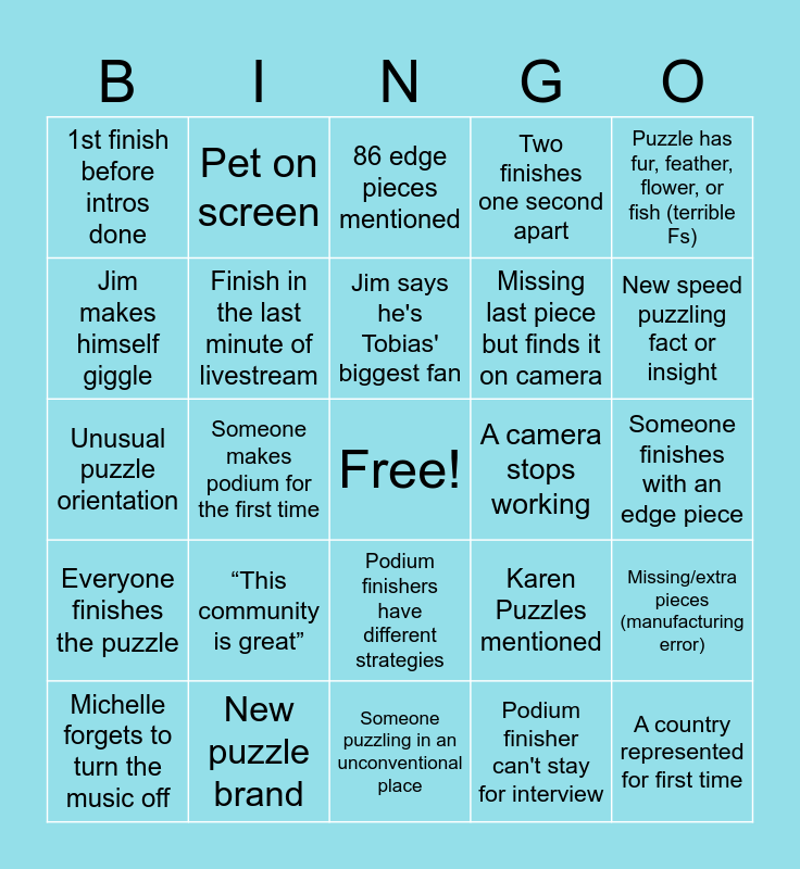 This bingo card has a free space and 24 words: “This community is great”, New puzzle brand, Jim says he's Tobias' biggest fan, Michelle forgets to turn the music off, Puzzle has fur, feather, flower, or fish (terrible Fs), 1st finish before intros done, Jim makes himself giggle, Pet on screen, A camera stops working, Podium finishers have different strategies, Missing last piece but finds it on camera, Unusual puzzle orientation, Karen Puzzles mentioned, Missing/extra pieces (manufacturing error), Finish in the last minute of livestream, Podium finisher can't stay for interview, Someone finishes with an edge piece, 86 edge pieces mentioned, New speed puzzling fact or insight, Someone makes podium for the first time, A country represented for first time, Everyone finishes the puzzle, Two finishes one second apart and Someone puzzling in an unconventional place.