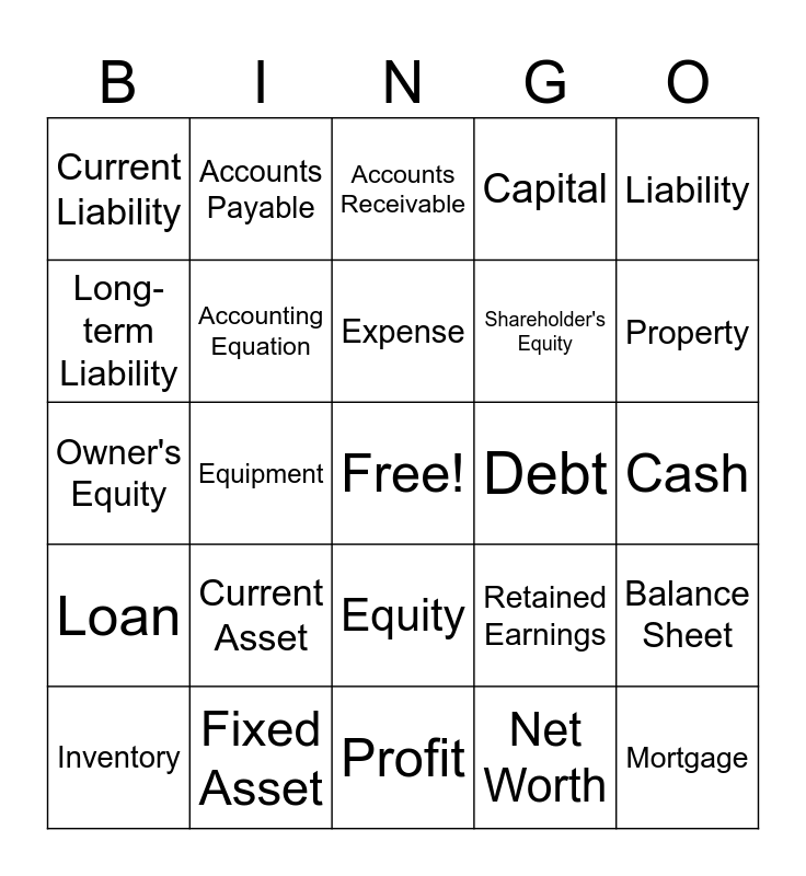 This bingo card has a free space and 24 words: Current Asset, Fixed Asset, Expense, Inventory, Liability, Current Liability, Long-term Liability, Accounts Payable, Debt, Equity, Shareholder's Equity, Owner's Equity, Retained Earnings, Balance Sheet, Accounting Equation, Net Worth, Cash, Accounts Receivable, Property, Equipment, Mortgage, Loan, Capital and Profit.
