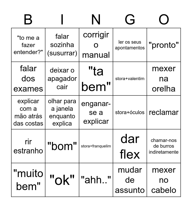 This bingo card has a free space and 24 words: "bom", "ok", "ta bem", "muito bem", "pronto", "to me a fazer entender?", falar dos exames, falar sozinha (susurrar), stora+óculos, stora+franquelim, stora+valentim, explicar com a mão atrás das costas, dar flex, chamar-nos de burros indiretamente, deixar o apagador cair, mudar de assunto, reclamar, corrigir o manual, mexer na orelha, olhar para a janela enquanto explica, mexer no cabelo, rir estranho, ler os seus apontamentos and "ahh..".