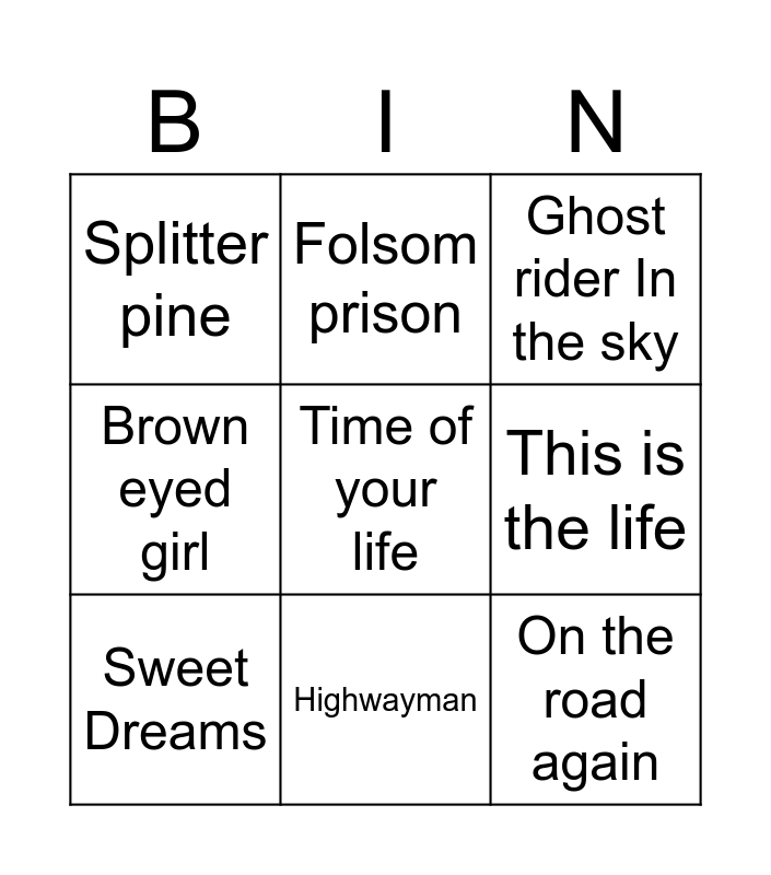 This bingo card has 32 words: Dancing in the dark, I`m on fire, Kanskje du behøver noen, Jolene, Hotel California, Sweet Dreams, Time of your life, Krasafaren Steinbu, Folsom prison, Ring of fire, Highwayman, Ghost rider In the sky, Kjærleken ventar, The Gambler, Ruby, dont take your love to town, Naboen, Hodet over vannet, Dont look back in anger, Wonderwall, Idyll, The Boxer, Free falling, Learning to fly, With or without you, One, Brown eyed girl, On the road again, This is the life, Splitter pine, Tigergutt, Summer of 69 and Pay me my money down.