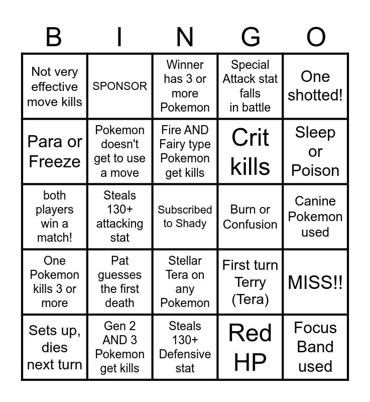 This bingo card has a free space and 24 words: Pat guesses the first death, Gen 2 AND 3 Pokemon get kills, Fire AND Fairy type Pokemon get kills, Sets up, dies next turn, One shotted!, Not very effective move kills, Para or Freeze, SPONSOR, Burn or Confusion, Stellar Tera on any Pokemon, Crit kills, both players win a match!, First turn Terry (Tera), MISS!!, Pokemon doesn't get to use a move, Red HP, Canine Pokemon used, Winner has 3 or more Pokemon, Sleep or Poison, Steals 130+ attacking stat, Focus Band used, One Pokemon kills 3 or more, Special Attack stat falls in battle and Steals 130+ Defensive stat.