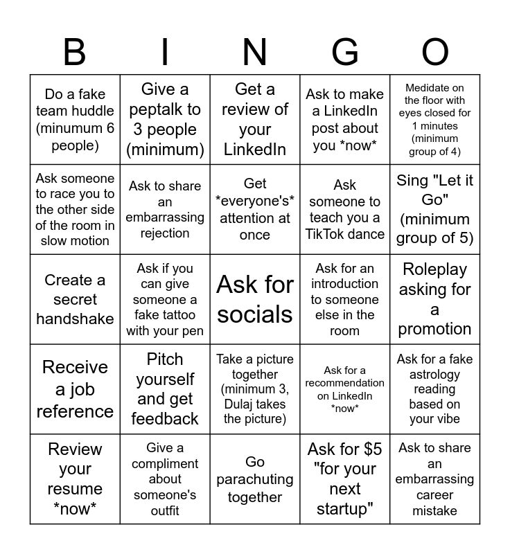 This bingo card has a free space and 34 words: Trade an accessory for 5 mintues, Ask for $5 "for your next startup", Shout "pancakes" with you, Roleplay: interview them for your occupation/job, Receive a job reference, Ask to share an embarrassing rejection, Medidate on the floor with eyes closed for 1 minutes (minimum group of 4), Review your resume *now*, Give a peptalk to 3 people (minimum), Organise a coffee catchup, Get *everyone's* attention at once, Get a review of your LinkedIn, Compliment a skill you've noticed, Do a story post of your face on their instagram, Ask for an introduction to someone else in the room, Sing "Let it Go"(minimum group of 5), Give a compliment about someone's outfit, Create a secret handshake, Pitch yourself and get feedback, Ask for a recommendation on LinkedIn *now*, Take a picture together (minimum 3, Dulaj takes the picture), Roleplay a car dealership, Do a fake team huddle (minumum 6 people), Roleplay asking for a promotion, Go parachuting together, Ask to share an embarrassing career mistake, Ask to make a LinkedIn post about you *now*, Ask for constructive criticism, Ask someone to teach you a TikTok dance, Ask someone to race you to the other side of the room in slow motion, Create an Instagram reel together about AskAnyway, Ask if you can give someone a fake tattoo with your pen, Ask for a fake astrology reading based on your vibe and Get a social from *everyone*.