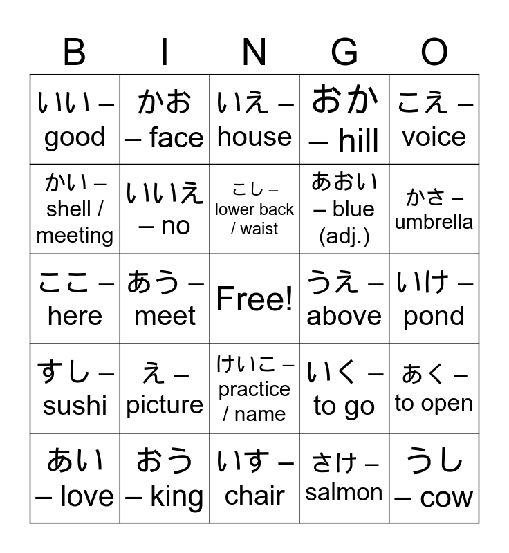 This bingo card has a free space and 29 words: あい – love, あお – blue, あう – meet, いう – say, いい – good, いえ – house, いいえ – no, え – picture, うえ – above, おう – king, いけ – pond, うし – cow, いす – chair, さけ – salmon, かさ – umbrella, うそ – lie, けいこ – practice / name, すし – sushi, こえ – voice, ここ – here, いく – to go, あさ – morning, あおい – blue (adj.), かい – shell / meeting, おか – hill, かお – face, あく – to open, こし – lower back / waist and せかい – world.