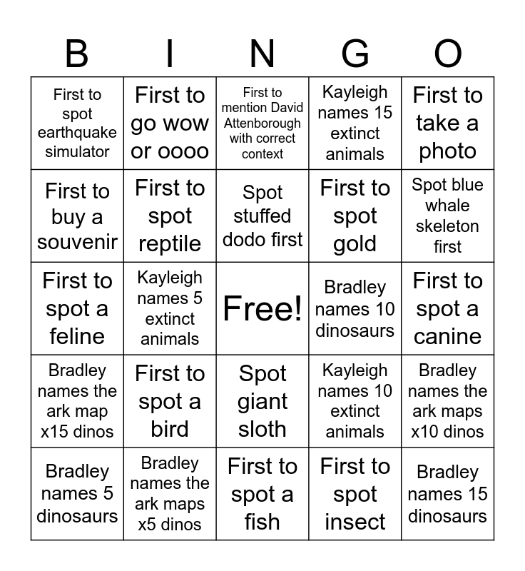 This bingo card has a free space and 24 words: Bradley names 5 dinosaurs, First to spot a bird, Spot stuffed dodo first, First to spot insect, First to take a photo, First to spot earthquake simulator, First to go wow or oooo, First to mention David Attenborough with correct context, Bradley names 10 dinosaurs, First to spot a canine, First to spot a feline, First to spot reptile, Kayleigh names 10 extinct animals, Bradley names the ark maps x10 dinos, First to buy a souvenir, Bradley names the ark maps x5 dinos, First to spot a fish, Kayleigh names 15 extinct animals, Spot blue whale skeleton first, Bradley names the ark map x15 dinos, Kayleigh names 5 extinct animals, Spot giant sloth, First to spot gold and Bradley names 15 dinosaurs.