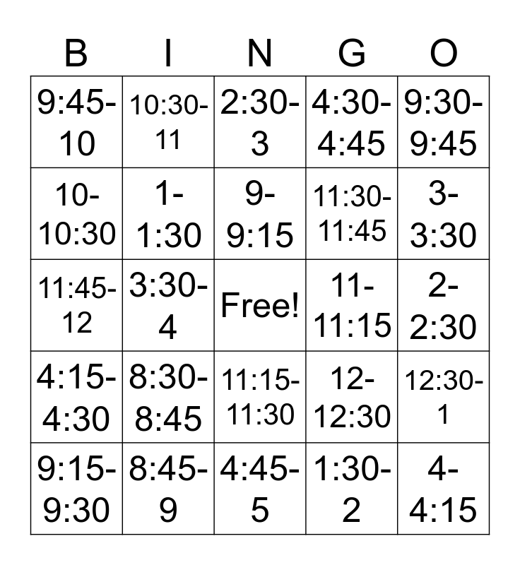 This bingo card has a free space and 24 words: 8:30-8:45, 8:45-9, 9-9:15, 9:15-9:30, 9:30-9:45, 9:45-10, 10-10:30, 10:30-11, 11-11:15, 11:15-11:30, 11:30-11:45, 11:45-12, 12-12:30, 12:30-1, 1-1:30, 1:30-2, 2-2:30, 2:30-3, 3-3:30, 3:30-4, 4-4:15, 4:15-4:30, 4:30-4:45 and 4:45-5.