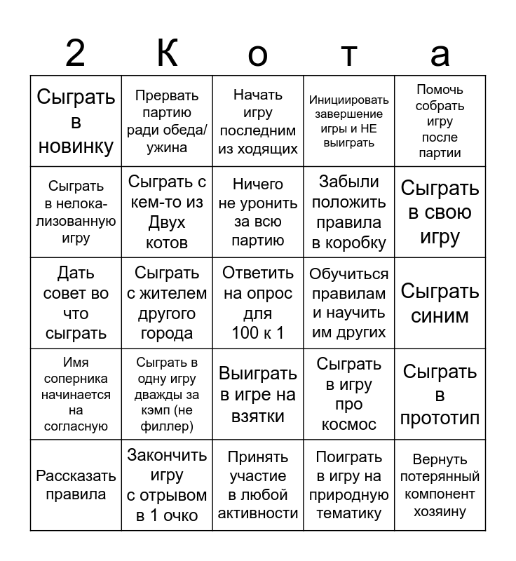 This bingo card has a free space and 44 words: Сыграть с новичком Орекона, Вернуть потерянный компонент хозяину, Поиграть одной и той же компанией две игры подряд, Рассказать правила, Сыграть за "предателя", Поиграть в игру на природную тематику, Начать игру последним из ходящих, Начать игру первым из ходящих, Помочь собрать игру после партии, Закончить игру с отрывом в 1 очко, Инициировать завершение игры и НЕ выиграть, Обучиться правилам и научить им других, Выиграть в игре на взятки, Сыграть в одну игру дважды за кэмп (не филлер), Обучить правилам, не играя самому, Принять участие в любой активности, Сыграть в игру Фельда, Дать совет во что сыграть, Сыграть в дуэль, Сыграть в свою игру, Прервать партию ради обеда/ужина, Сыграть с двумя тёзками, Обыграть того самого, Сыграть в новинку, Сыграть красным, Сыграть синим, Сыграть в игру Ласерды, Патигейм, евро и амери в один день, Сыграть в игру про космос, Имя соперника начинается на согласную, Сыграть максимальным составом, Сыграть в прототип, Договориться о партии через чат Орекона, Быть преданным своим Сwazi (или аналог), Сыграть с жителем другого города, Сыграть жёлтым, Не менее 3х слов в названии игры, Запостить идею для следующего Бинго, Ничего не уронить за всю партию, Сыграть в нелока-лизованную игру, Забыли положить правила в коробку, Победить или проиграть по тайбрейку, Сыграть с кем-то из Двух котов and Набрать больше сотни очков.