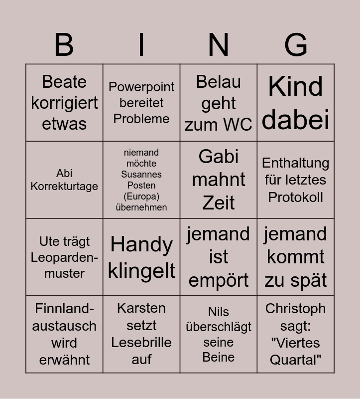 This bingo card has 16 words: Karsten setzt Lesebrille auf, jemand kommt zu spät, Belau geht zum WC, Beate korrigiert etwas, Ute trägt Leoparden- muster, Powerpoint bereitet Probleme, jemand ist empört, Nils überschlägt seine Beine, Abi Korrekturtage, niemand möchte Susannes Posten (Europa) übernehmen, Finnland- austausch wird erwähnt, Kind dabei, Handy klingelt, Enthaltung für letztes Protokoll, Gabi mahnt Zeit and Christoph sagt: "Viertes Quartal".