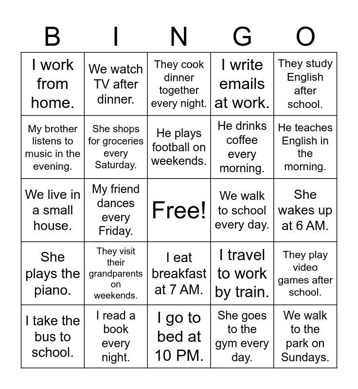 This bingo card has a free space and 26 words: I eat breakfast at 7 AM., She goes to the gym every day., He plays football on weekends., I read a book every night., They study English after school., I work from home., My brother listens to music in the evening., We watch TV after dinner., She wakes up at 6 AM., I travel to work by train., He drinks coffee every morning., We live in a small house., They play video games after school., I take the bus to school., My friend dances every Friday., He drinks tea in the afternoon., I write emails at work., She plays the piano., They cook dinner together every night., We walk to the park on Sundays., He teaches English in the morning., I go to bed at 10 PM., We walk to school every day., They visit their grandparents on weekends., She shops for groceries every Saturday. and I clean my room every week..