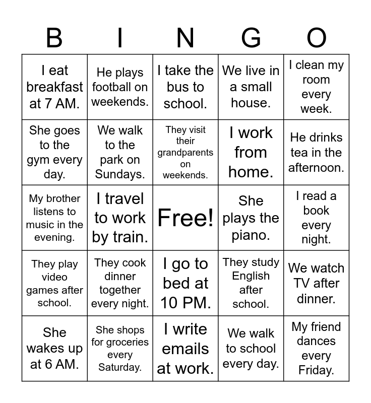 This bingo card has a free space and 26 words: I go to bed at 10 PM., We walk to school every day., They visit their grandparents on weekends., She shops for groceries every Saturday., I clean my room every week., I eat breakfast at 7 AM., She goes to the gym every day., He plays football on weekends., I read a book every night., They study English after school., I work from home., My brother listens to music in the evening., We watch TV after dinner., She wakes up at 6 AM., I travel to work by train., He drinks coffee every morning., We live in a small house., They play video games after school., I take the bus to school., My friend dances every Friday., He drinks tea in the afternoon., I write emails at work., She plays the piano., They cook dinner together every night., We walk to the park on Sundays. and He teaches English in the morning..