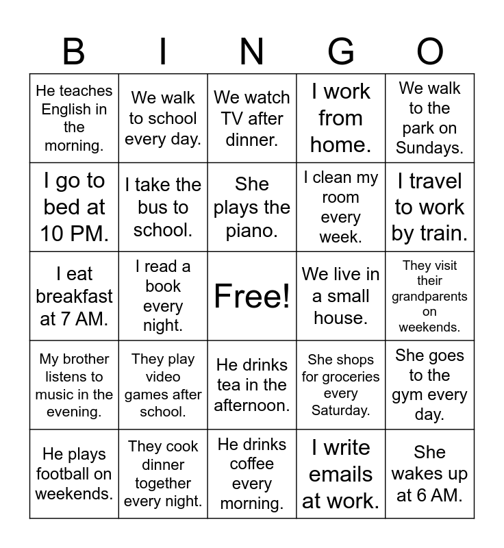 This bingo card has a free space and 26 words: He drinks tea in the afternoon., I write emails at work., She plays the piano., They cook dinner together every night., We walk to the park on Sundays., He teaches English in the morning., I go to bed at 10 PM., We walk to school every day., They visit their grandparents on weekends., She shops for groceries every Saturday., I clean my room every week., I eat breakfast at 7 AM., She goes to the gym every day., He plays football on weekends., I read a book every night., They study English after school., I work from home., My brother listens to music in the evening., We watch TV after dinner., She wakes up at 6 AM., I travel to work by train., He drinks coffee every morning., We live in a small house., They play video games after school., I take the bus to school. and My friend dances every Friday..