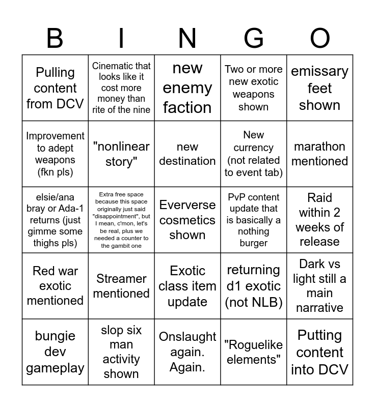 This bingo card has a free space and 34 words: New Subclass, "Roguelike elements", A mechanic somehow getting worse, Noah on stream, Red war exotic mentioned, "nonlinear story", emissary feet shown, bungie dev gameplay, Cinematic that looks like it cost more money than rite of the nine, "we got one last thing to show you", new destination, new enemy faction, new weapon archetype shown, "new" supers, PvP content update that is basically a nothing burger, marathon mentioned, slop six man activity shown, elsie/ana bray or Ada-1 returns (just gimme some thighs pls), Streamer mentioned, returning d1 exotic (not NLB), Exotic class item update, increased vault space, Pulling content from DCV, Raid within 2 weeks of release, Onslaught again. Again., Putting content into DCV, Two or more new exotic weapons shown, Less than two (1 or 0) exotic armor per class shown, New currency (not related to event tab), Improvement to adept weapons (fkn pls), Meaningful update/Rework to gambit (nobody's getting this space), Extra free space because this space originally just said "disappointment", but I mean, c'mon, let's be real, plus we needed a counter to the gambit one, Dark vs light still a main narrative and Edge of fate release in/after mid July.