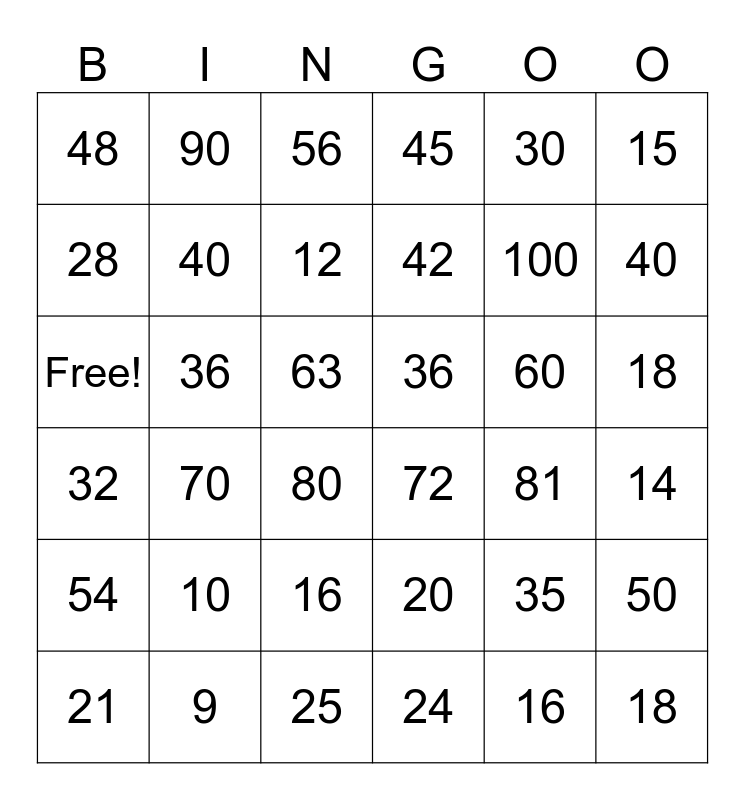 This bingo card has 36 words: 20, 16, 24, 28, 32, 36, 40, 25, 30, 35, 40, 45, 50, 36, 42, 48, 54, 60, Free!, 56, 63, 70, 72, 80, 81, 90, 100, 9, 12, 15, 18, 21, 14, 18, 10 and 16.