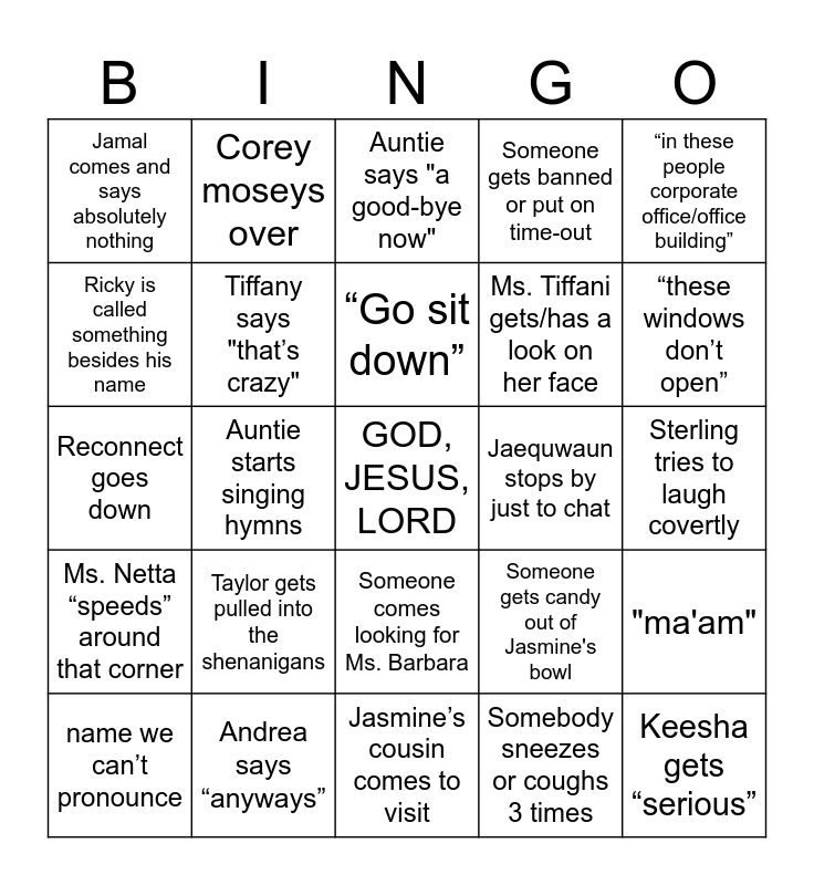 This bingo card has a free space and 24 words: Taylor gets pulled into the shenanigans, Andrea says “anyways”, “Go sit down”, name we can’t pronounce, “in these people corporate office/office building”, Jamal comes and says absolutely nothing, Ricky is called something besides his name, Corey moseys over, Jaequwaun stops by just to chat, Someone comes looking for Ms. Barbara, Ms. Tiffani gets/has a look on her face, Reconnect goes down, Someone gets candy out of Jasmine's bowl, "ma'am", Tiffany says "that’s crazy", Somebody sneezes or coughs 3 times, Sterling tries to laugh covertly, Auntie says "a good-bye now", “these windows don’t open”, Auntie starts singing hymns, Keesha gets “serious”, Ms. Netta “speeds” around that corner, Someone gets banned or put on time-out and Jasmine’s cousin comes to visit.