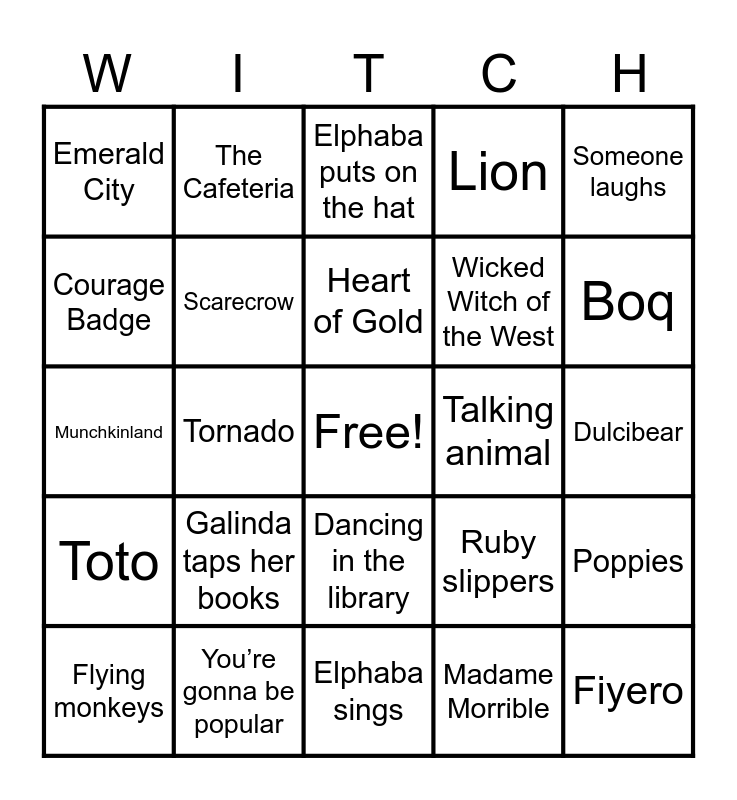 This bingo card has a free space and 44 words: A singing goat, Fiyero, Glinda floats in a bubble, Flying monkeys, Baby Elphaba, Madame Morrible, Elphaba puts on the hat, Magic wand, Someone laughs, You’re gonna be popular, Lion, Talking animal, Dancing in the library, Galinda taps her books, Nessarose, Elphaba sings, Toss Toss, Munchkinland, A baby lion, Boq, The Cafeteria, Shiz University, A train to Oz, Emerald City, Glinda hangs from the chandelier, Dulcibear, crown, Elphaba moves in with Glinda, Ruby slippers, Toto, Glinda's Glitter, Poppies, Green Room, Yellow Brick Road, Tornado, Book of Spells, Good Witch Vibes, Black Hat, Heart of Gold, Courage Badge, Wicked Witch of the West, Green Elixer, Scarecrow and Tin Man.
