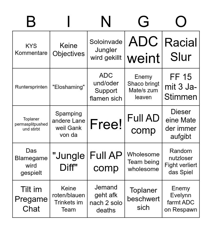This bingo card has a free space and 25 words: "Jungle Diff", Jemand geht afk nach 2 solo deaths, ADC und/oder Support flamen sich, Tilt im Pregame Chat, Racial Slur, KYS Kommentare, Runtersprinten, Keine Objectives, Full AD comp, Full AP comp, Enemy Shaco bringt Mate/s zum leaven, Toplaner permasplitpushed und stirbt, Wholesome Team being wholesome, Random nutzloser Fight verliert das Spiel, "Eloshaming", "Ich bin besser als du", Dieser eine Mate der immer aufgibt, Soloinvade Jungler wird gekillt, FF 15 mit 3 Ja-Stimmen, Spamping andere Lane weil Gank von da, Enemy Evelynn farmt ADC on Respawn, Keine roten/blauen Trinkets im Team, Das Blamegame wird gespielt, ADC weint and Toplaner beschwert sich.