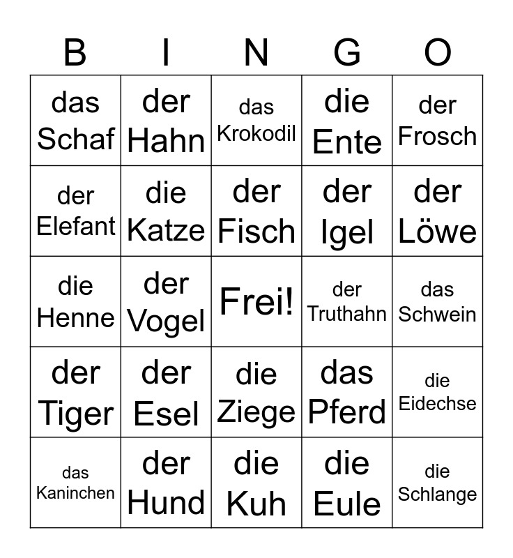 This bingo card has a free space and 24 words: der Esel, der Hund, der Fisch, das Kaninchen, der Frosch, das Schaf, der Elefant, der Hahn, der Truthahn, die Ziege, der Igel, die Henne, das Pferd, die Eidechse, die Katze, die Eule, das Schwein, das Krokodil, der Löwe, der Vogel, die Schlange, der Tiger, die Ente and die Kuh.