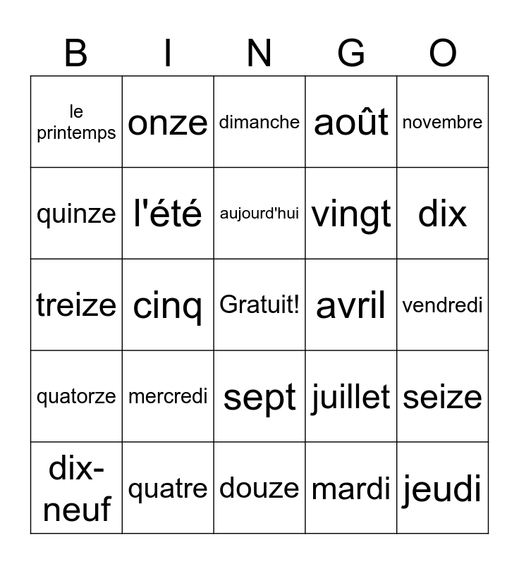This bingo card has a free space and 24 words: mercredi, quatre, aujourd'hui, dix-neuf, novembre, le printemps, quinze, onze, avril, sept, vingt, treize, juillet, seize, l'été, mardi, vendredi, dimanche, dix, cinq, jeudi, quatorze, août and douze.
