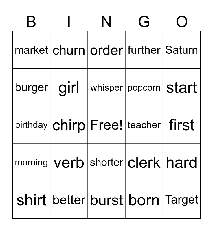 This bingo card has a free space and 24 words: verb, better, whisper, shirt, Saturn, market, burger, churn, teacher, shorter, popcorn, birthday, clerk, hard, girl, born, first, order, start, chirp, Target, morning, further and burst.