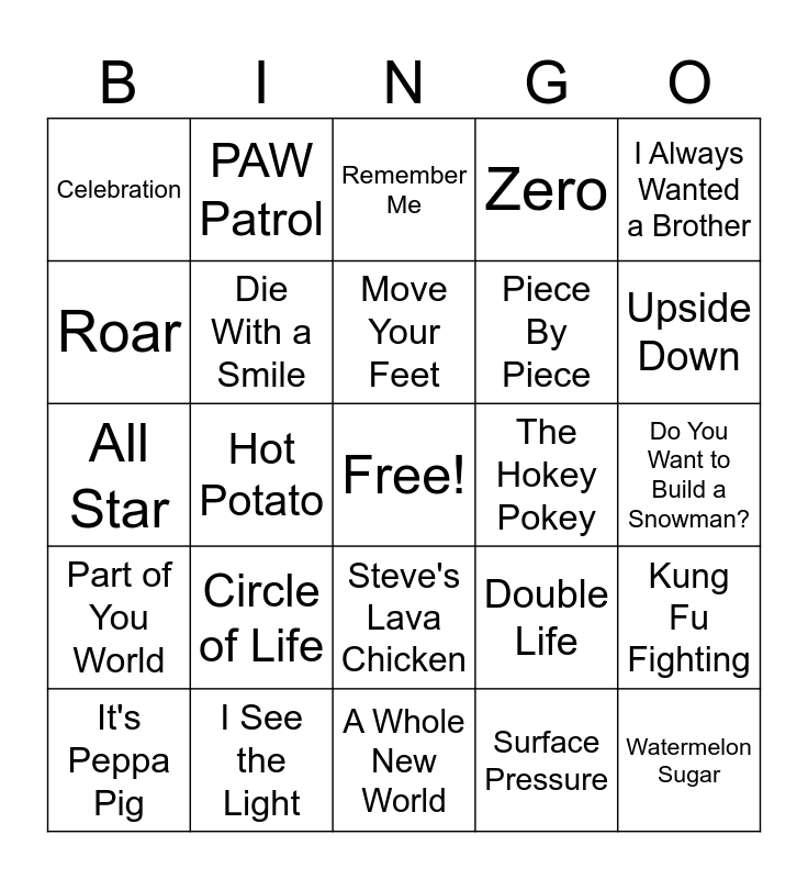 This bingo card has a free space and 31 words: A Whole New World, Be Our Guest, Hot Potato, Life Is a Highway, Celebration, Remember Me, Die With a Smile, Double Life, The Hokey Pokey, Surface Pressure, Do You Want to Build a Snowman?, Watermelon Sugar, Into the Unknown, Dancing in the Dark, Upside Down, Flowers, Kung Fu Fighting, Circle of Life, Part of You World, Steve's Lava Chicken, I Always Wanted a Brother, Shiny, It's Peppa Pig, PAW Patrol, Piece By Piece, Roar, Zero, All Star, I See the Light, Move Your Feet and Try Everything.