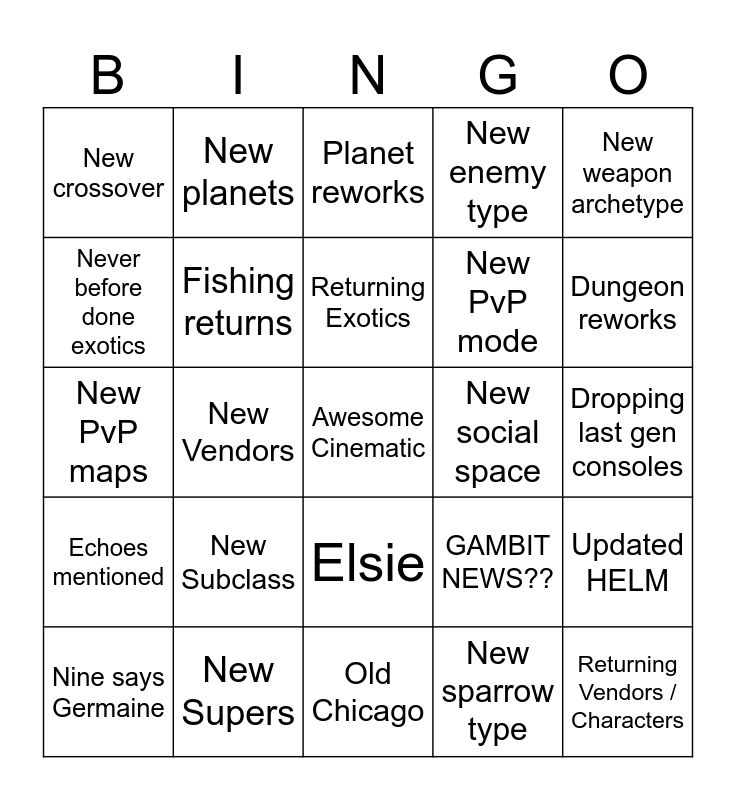 This bingo card has a free space and 24 words: New Subclass, New Supers, Returning Exotics, Nine says Germaine, New weapon archetype, New crossover, Never before done exotics, New planets, New social space, Elsie, New PvP mode, New PvP maps, GAMBIT NEWS??, Updated HELM, Fishing returns, New sparrow type, Dropping last gen consoles, Planet reworks, Dungeon reworks, New Vendors, Returning Vendors / Characters, Echoes mentioned, New enemy type and Old Chicago.