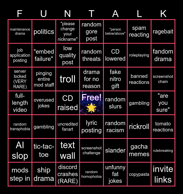 This bingo card has a free space and 48 words: slander, roleplaying, random homophobia, overused jokes, troll, "are you sure", politics, ship drama, spam reacting, lyric posting, ragebait, random gore post, banned reactions, fake nitro gift, AI slop, gambling, job application posting, fandom drama, gacha memes, "person below/above", CD lowered, CD raised, maintenance drama, "embed failure", rulebreaking, low quality post, screenshot chain, mods step in, drama for no reason, pinging entire mod staff, copypasta, random slurs, tomato reactions, tic-tac-toe, full-length video, random racism, rickroll, server locked (VERY RARE), uncredited fanart, text wall, random transphobia, invite links, "please change your nickname", discord crashes (RARE), random threats, screenshot challenge, gambling and unfunny fat jokes.