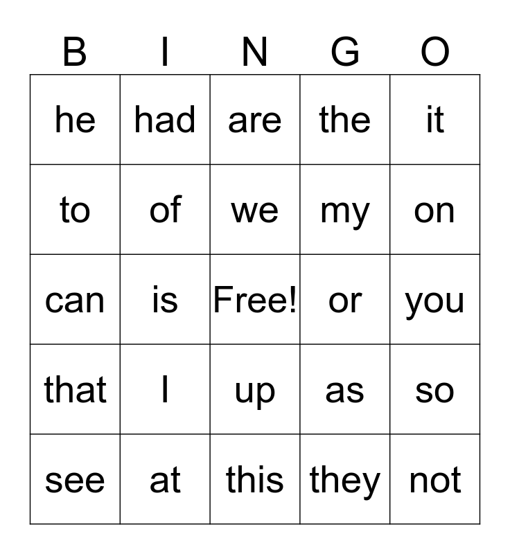 This bingo card has a free space and 24 words: I, at, we, see, it, he, to, had, or, up, my, can, as, so, of, they, you, are, on, is, not, that, the and this.