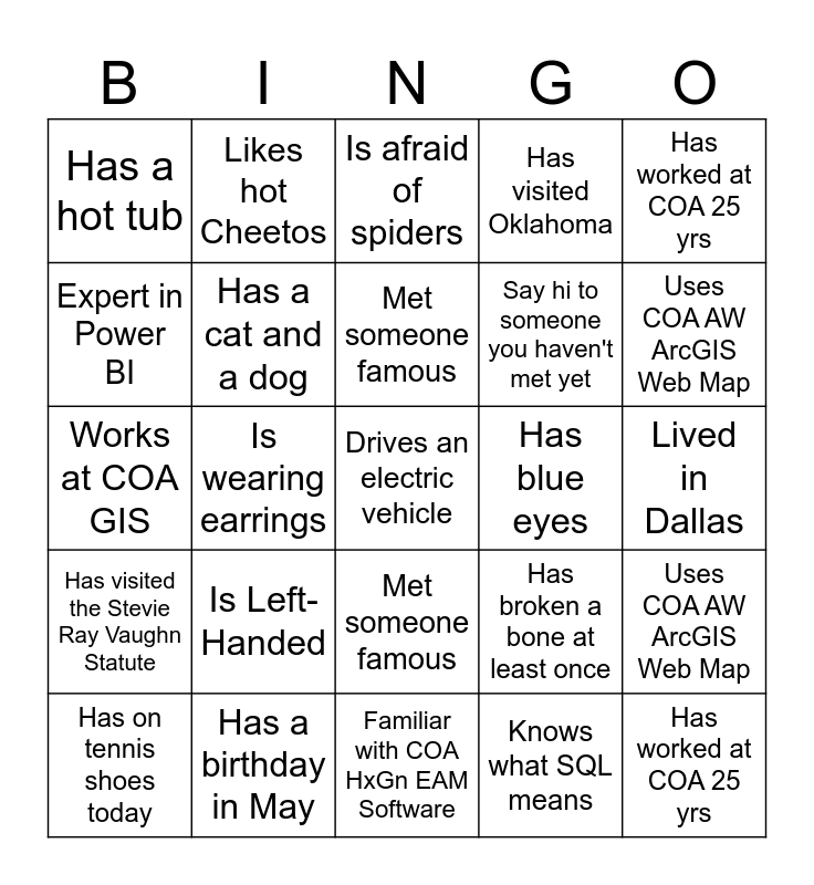 This bingo card has 59 words: Has a tattoo, Has a birthday in May, Does not like pizza, Has blue eyes, Has worked at COA 25 yrs, Has on tennis shoes today, Has a cat and a dog, Drives an electric vehicle, Has visited Oklahoma, Lived in Dallas, Expert in Power BI, Is Left-Handed, Met someone famous, Has traveled overseas, Forget to put yourself on mute, Has a hot tub, Is wearing earrings, Is afraid of spiders, Has broken a bone at least once, Uses COA AW ArcGIS Web Map, Works at COA GIS, Likes hot Cheetos, Familiar with COA HxGn EAM Software, Knows what SQL means, Knows what Zilker Botanical Gardens is often called, Has been to Barking Springs, Has visited the Stevie Ray Vaughn Statute, Has been to a UT Longhorn football game, Say hi to someone you haven't met yet, Seen Willie Nelson in concert, Has a tattoo, Has a birthday in May, Does not like pizza, Has blue eyes, Has worked at COA 25 yrs, Has on tennis shoes today, Has a cat and a dog, Drives an electric vehicle, Has visited Oklahoma, Lived in Dallas, Expert in Power BI, Is Left-Handed, Met someone famous, Has traveled overseas, Forget to put yourself on mute, Has a hot tub, Is wearing earrings, Is afraid of spiders, Has broken a bone at least once, Uses COA AW ArcGIS Web Map, Likes hot Cheetos, Familiar with COA HxGn EAM Software, Knows what SQL means, Knows what Zilker Botanical Gardens is often called, Has been to Barking Springs, Has visited the Stevie Ray Vaughn Statute, Has been to a UT Longhorn football game, Say hi to someone you haven't met yet and Seen Willie Nelson in concert.