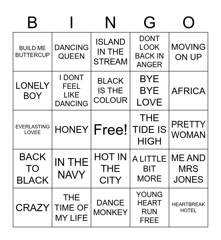 This bingo card has a free space and 44 words: BUNCH OF THYNE, HEARTBREAK HOTEL, ITS MY PARTY, CRAZY, TELL IT TO THE WORLD, YOUNG HEART RUN FREE, ISLAND IN THE STREAM, THE LEAVING OF LIVERPOOL, MOVING ON UP, THE TIME OF MY LIFE, DONT LOOK BACK IN ANGER, THE TIDE IS HIGH, HOT IN THE CITY, IN THE NAVY, STEP BY STEP, DANCE MONKEY, KISS, EVERLASTING LOVEE, THIS OLDE HOUSE, AFRICA, DANCING QUEEN, YOU SEXY THING, MANIC MONDAY, BUILD ME BUTTERCUP, I WILL ALWAYS LOVE YOU, PRETTY WOMAN, CHAIN REACTION, IF I WAS A CARPENTER, A LITTLE BIT MORE, BACK TO BLACK, DAYDREAM BELIEVER, ME AND MRS JONES, RAT TRAP, SIMPLY THE BEST, HONEY, YOUNG GIRL, CRY TO ME, SHES LIKE THE WIND, BLACK IS THE COLOUR, LONELY BOY, BYE BYE LOVE, LIGHT MY FIRE, I DONT FEEL LIKE DANCING and LIVIN ON A PRAYER.