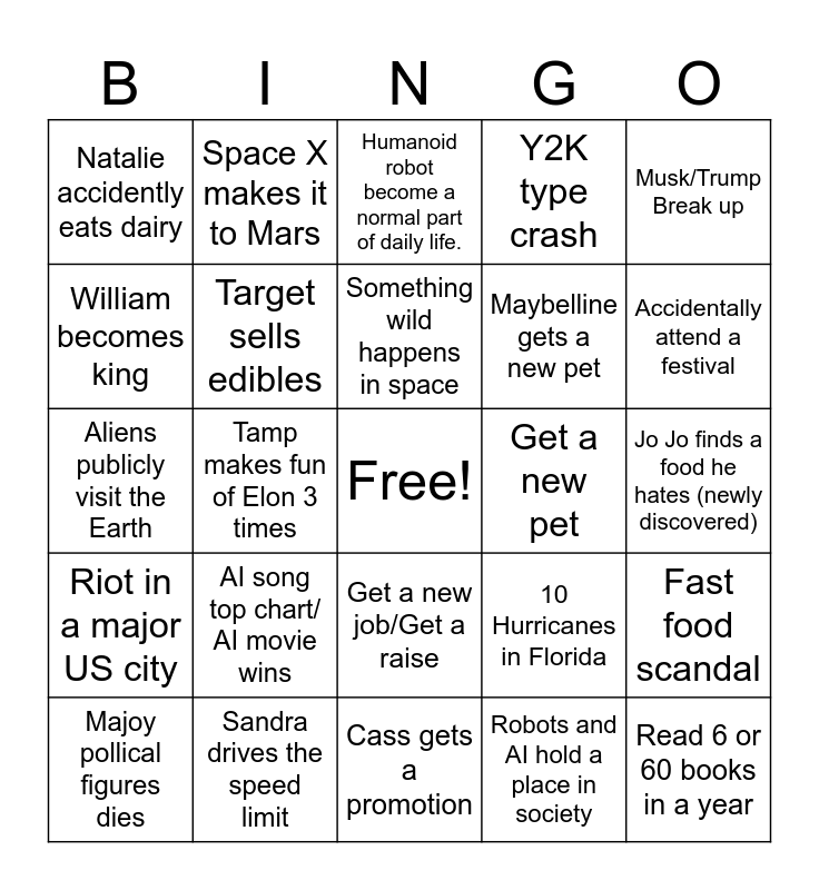 This bingo card has a free space and 28 words: Majoy pollical figures dies, TikTok banned for good, Something wild happens in space, Robots and AI hold a place in society, Musk/Trump Break up, William becomes king, Space X makes it to Mars, Get a new job/Get a raise, Get a new pet, Read 6 or 60 books in a year, Aliens publicly visit the Earth, Target sells edibles, Gas hits $7, 10 Hurricanes in Florida, Accidentally attend a festival, Celebrity or political figured are cloned, AI song top chart/ AI movie wins, Humanoid robot become a normal part of daily life., Y2K type crash, Fast food scandal, Natalie accidently eats dairy, Sandra drives the speed limit, Cass gets a promotion, Maybelline gets a new pet, Jo Jo finds a food he hates (newly discovered), Riot in a major US city, Tamp makes fun of Elon 3 times and New species is discovered.