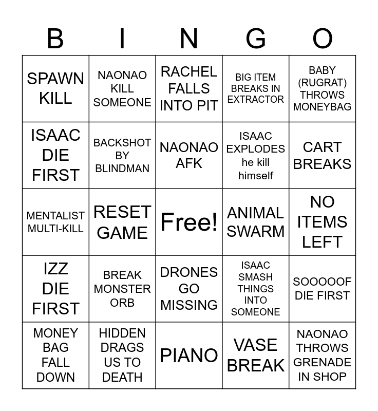 This bingo card has a free space and 24 words: BREAK MONSTER ORB, HIDDEN DRAGS US TO DEATH, NAONAO AFK, MONEY BAG FALL DOWN, BABY (RUGRAT) THROWS MONEYBAG, SPAWN KILL, ISAAC DIE FIRST, NAONAO KILL SOMEONE, ANIMAL SWARM, DRONES GO MISSING, ISAAC EXPLODES he kill himself, MENTALIST MULTI-KILL, ISAAC SMASH THINGS INTO SOMEONE, SOOOOOF DIE FIRST, BACKSHOT BY BLINDMAN, VASE BREAK, NO ITEMS LEFT, RACHEL FALLS INTO PIT, CART BREAKS, RESET GAME, NAONAO THROWS GRENADE IN SHOP, IZZ DIE FIRST, BIG ITEM BREAKS IN EXTRACTOR and PIANO.
