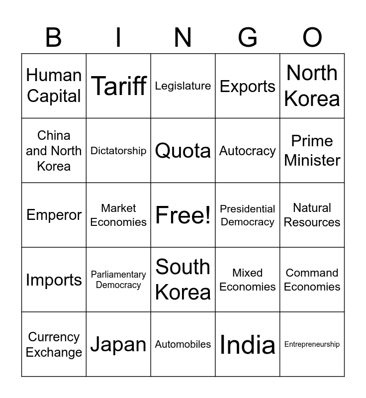 This bingo card has a free space and 24 words: Parliamentary Democracy, Japan, Quota, Currency Exchange, North Korea, Human Capital, China and North Korea, Tariff, Presidential Democracy, South Korea, Autocracy, Emperor, Mixed Economies, Command Economies, Dictatorship, India, Natural Resources, Legislature, Prime Minister, Market Economies, Entrepreneurship, Imports, Exports and Automobiles.