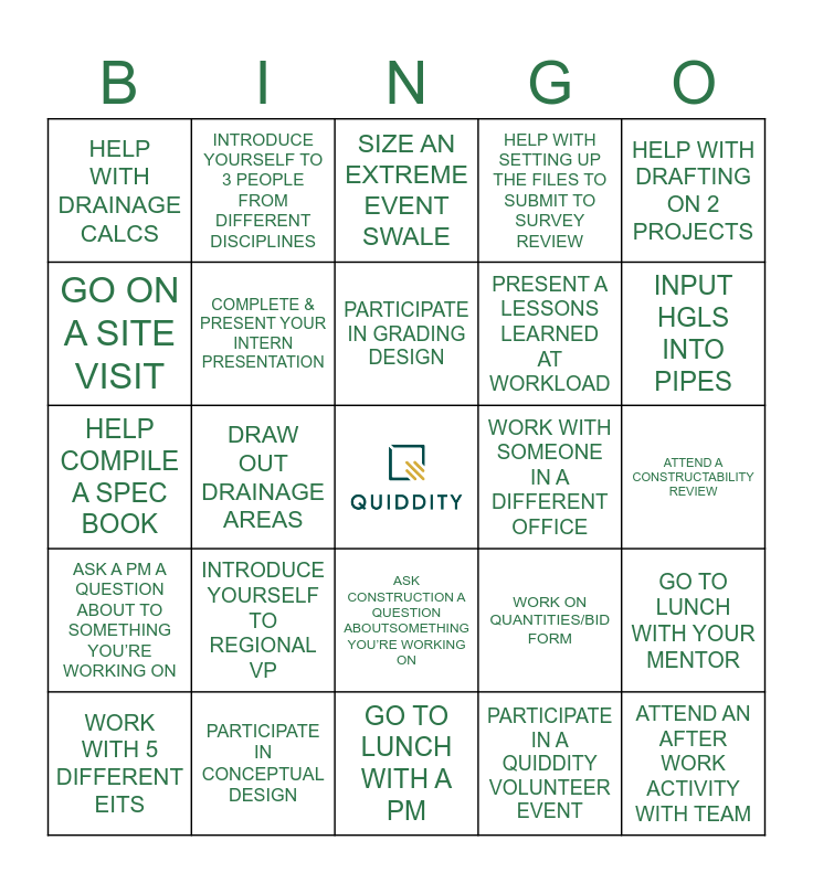 This bingo card has a free space and 24 words: INTRODUCE YOURSELF TO REGIONAL VP, PARTICIPATE IN CONCEPTUAL DESIGN, PARTICIPATE IN GRADING DESIGN, WORK WITH 5 DIFFERENT EITS, HELP WITH DRAFTING ON 2 PROJECTS, HELP WITH DRAINAGE CALCS, GO ON A SITE VISIT, INTRODUCE YOURSELF TO 3 PEOPLE FROM DIFFERENT DISCIPLINES, WORK WITH SOMEONE IN A DIFFERENT OFFICE, ASK CONSTRUCTION A QUESTION ABOUTSOMETHING YOU’RE WORKING ON, PRESENT A LESSONS LEARNED AT WORKLOAD, HELP COMPILE A SPEC BOOK, WORK ON QUANTITIES/BID FORM, GO TO LUNCH WITH YOUR MENTOR, COMPLETE & PRESENT YOUR INTERN PRESENTATION, PARTICIPATE IN A QUIDDITY VOLUNTEER EVENT, ATTEND A CONSTRUCTABILITY REVIEW, SIZE AN EXTREME EVENT SWALE, INPUT HGLS INTO PIPES, DRAW OUT DRAINAGE AREAS, ATTEND AN AFTER WORK ACTIVITY WITH TEAM, ASK A PM A QUESTION ABOUT TO SOMETHING YOU’RE WORKING ON, HELP WITH SETTING UP THE FILES TO SUBMIT TO SURVEY REVIEW and GO TO LUNCH WITH A PM.