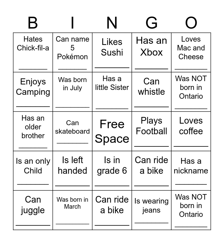 This bingo card has a free space and 34 words: Has a nickname _______, Is wearing jeans ________, Plays the piano _______, Has a Dog _______, Is an only Child _______, Was born in July _________, Loves Mac and Cheese ________, Can juggle _______, Can name 5 Pokémon _______, Hates Pizza _______, Has a little Sister ________, Likes Sushi _______, Can do taekwo ________, Can whistle _______, Plays Football _______, Was NOT born in Ontario ________, Was born in March __________, Has an older brother _______, Is left handed _______, Can ride a bike _______, Is in grade 6 _______, Plays soccer _______, Hates Chick-fil-a _______, Loves coffee _______, Can ride a bike _______, Was NOT born in Ontario ________, Has an Xbox ______, Can name 5 Pokémon _______, Can whistle _______, Enjoys Camping _______, Has a nickname _______, Can skateboard ________, Has a nickname _______ and Has a nickname _______.