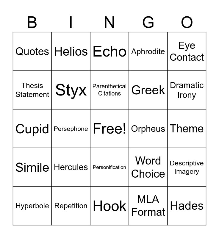 This bingo card has a free space and 49 words: Eurydice, Hades, Echo, Hook, Hercules, Bellerophon, Helios, Narcissus, Thesis Statement, "Readers", Styx, Aphrodite, Descriptive Imagery, Word Choice, Psyche, Reading Word for Word from Notecards, Parenthetical Citations, Orpheus, Cerberus, Eye Contact, Persephone, MLA Format, Quotes, Greek, Metaphor, Dramatic Irony, Hyperbole, Allusion, Personification, Simile, Alliteration, Works Cited, Onomatopoeia, Conclusion, Repetition, Situational Irony, Man v. Man, Symbol, Theme, Man v. Self, Verbal Irony, Man v. Nature, Foreshadowing, Oxymoron, Cupid, Echo, Introduction, Topic Sentence and Analysis.