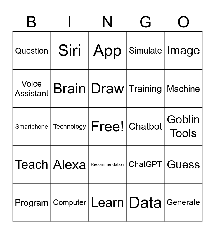 This bingo card has a free space and 24 words: Alexa, Computer, Draw, Program, Image, Question, Voice Assistant, Siri, Chatbot, Recommendation, Training, Smartphone, ChatGPT, Guess, Brain, Data, Goblin Tools, App, Machine, Technology, Generate, Teach, Simulate and Learn.