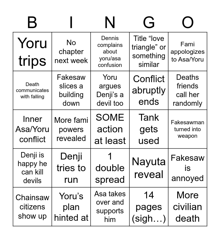 This bingo card has a free space and 24 words: Denji tries to run, Yoru’s plan hinted at, Yoru argues Denji’s a devil too, Chainsaw citizens show up, Fami appologizes to Asa/Yoru, Yoru trips, Death communicates with falling, No chapter next week, Tank gets used, 1 double spread, Conflict abruptly ends, Inner Asa/Yoru conflict, Nayuta reveal, Fakesaw is annoyed, Fakesaw slices a building down, 14 pages (sigh…), Fakesawman turned into weapon, Dennis complains about yoru/asa confusion, Deaths friends call her randomly, More fami powers revealed, More civilian death, Denji is happy he can kill devils, Title “love triangle” or something similar and Asa takes over and supports him.