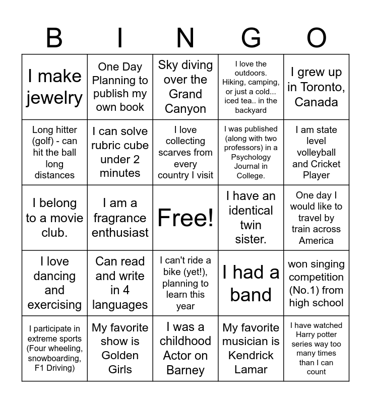 This bingo card has a free space and 24 words: Can read and write in 4 languages, My favorite show is Golden Girls, I love collecting scarves from every country I visit, I participate in extreme sports (Four wheeling, snowboarding, F1 Driving), I grew up in Toronto, Canada, I make jewelry, Long hitter (golf) - can hit the ball long distances, One Day Planning to publish my own book, I have an identical twin sister., I can't ride a bike (yet!), planning to learn this year, I was published (along with two professors) in a Psychology Journal in College., I belong to a movie club., I had a band, won singing competition (No.1) from high school, I can solve rubric cube under 2 minutes, My favorite musician is Kendrick Lamar, One day I would like to travel by train across America, Sky diving over the Grand Canyon, I am state level volleyball and Cricket Player, I am a fragrance enthusiast, I have watched Harry potter series way too many times than I can count, I love dancing and exercising, I love the outdoors. Hiking, camping, or just a cold... iced tea.. in the backyard and I was a childhood Actor on Barney.