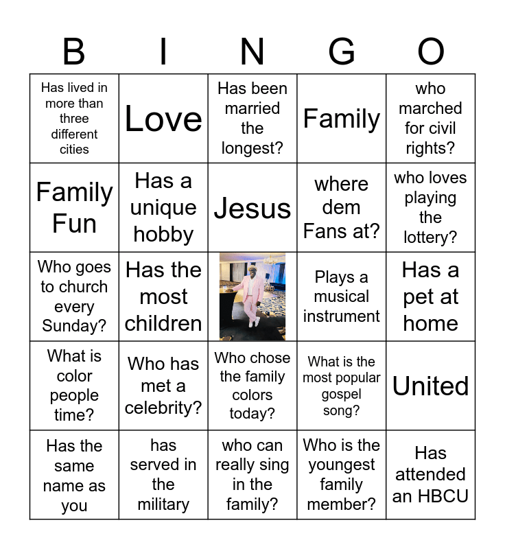 This bingo card has a free space and 29 words: Has the same name as you, The oldest family member here, Has the most children, Has traveled the farthest to the reunion, Has lived in more than three different cities, Has been married the longest?, Has a unique hobby, Who has met a celebrity?, Plays a musical instrument, has served in the military, Has a pet at home, Has attended an HBCU, who can really sing in the family?, Who is the youngest family member?, who loves playing the lottery?, Who is the party animal?, Who chose the family colors today?, What is color people time?, who marched for civil rights?, Who goes to church every Sunday?, What is the most popular gospel song?, Who know how to do the dance boots on the ground?, where dem Fans at?, Family Fun, Family, Love, United, Jesus and Worship.