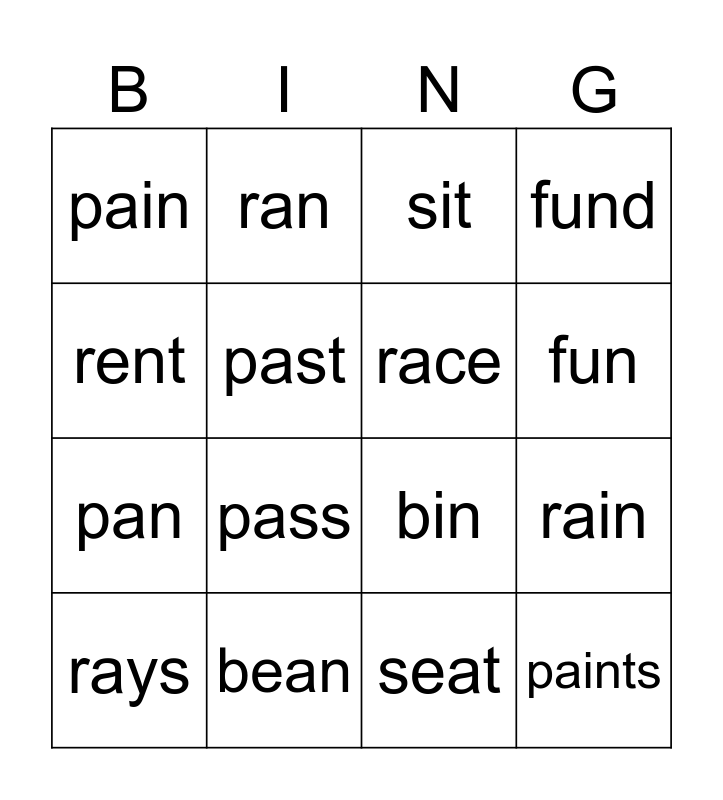 This bingo card has 16 words: bean, rain, sit, pain, pan, ran, bin, seat, rent, past, rays, fund, pass, fun, race and paints.