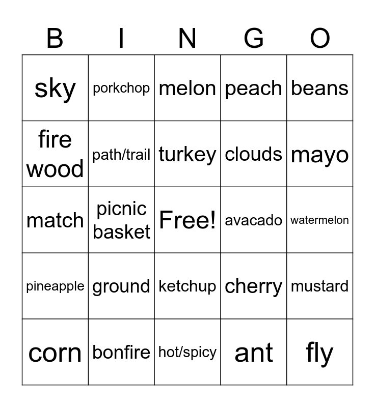 This bingo card has a free space and 24 words: ground, bonfire, turkey, corn, beans, sky, fire wood, porkchop, avacado, ketchup, clouds, match, cherry, mustard, path/trail, ant, watermelon, melon, mayo, picnic basket, fly, pineapple, peach and hot/spicy.