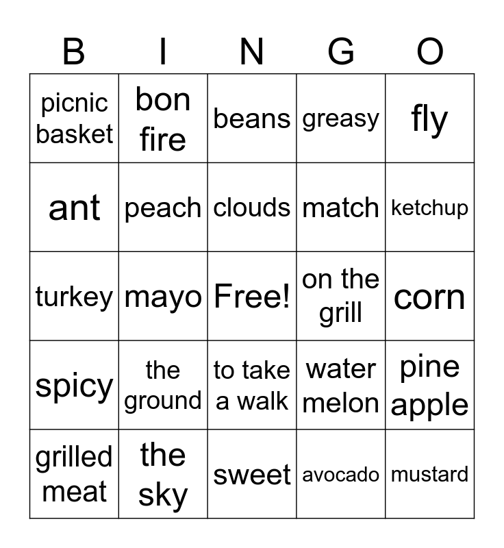 This bingo card has a free space and 24 words: the ground, the sky, clouds, grilled meat, fly, picnic basket, ant, bon fire, on the grill, to take a walk, match, turkey, water melon, pine apple, peach, avocado, corn, beans, ketchup, mayo, mustard, spicy, greasy and sweet.