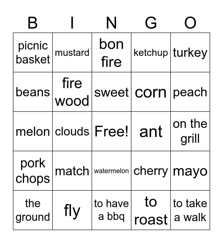 This bingo card has a free space and 29 words: the ground, the sky, clouds, the path, picnic basket, bon fire, fire wood, match, ant, fly, on the grill, to take a walk, to have a bbq, to roast, peach, pineapple, watermelon, pork chops, turkey, melon, cherry, avocado, corn, beans, ketchup, mustard, mayo, sweet and greasy.
