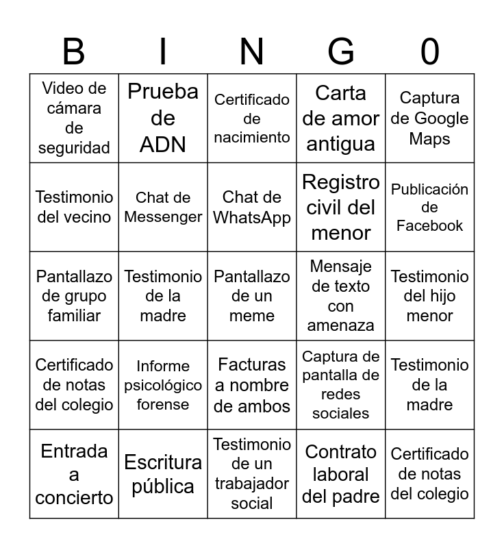 This bingo card has 45 words: Prueba de ADN, Testimonio de la madre, Registro civil del menor, Recibo de luz, Certificado de notas del colegio, Free!, Prueba de ADN, Grabación de llamada, Registro civil del menor, Testimonio de la madre, Testimonio del vecino, Informe psicológico forense, Chat de WhatsApp, Captura de pantalla de redes sociales, Contrato de arriendo conjunto, Factura de colegio, Recibo de luz, Certificado de nacimiento, Registro de llamadas, Publicación de Facebook, Video de cámara de seguridad, Foto de un cumpleaños, Pantallazo de un meme, Carta de amor antigua, Informe del ICBF, Entrada a concierto, Certificado médico, Recibo de supermercado, Contrato laboral del padre, Testimonio del hijo menor, Prueba pericial contable, Escritura pública, Facturas a nombre de ambos, Horóscopo del mes, Denuncia penal, Certificado de notas del colegio, Registro de propiedad, Testimonio de un trabajador social, Declaración de un portero, Captura de Google Maps, Pantallazo de grupo familiar, Chat de Messenger, Foto con mascota, Mensaje de texto con amenaza and Informe de policía.