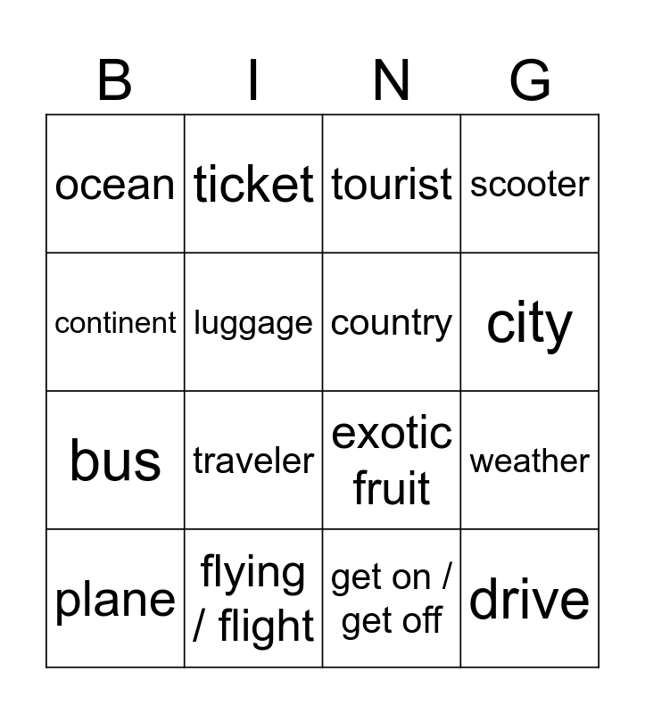 This bingo card has 16 words: flying / flight, weather, tourist, ocean, bus, ticket, exotic fruit, get on / get off, continent, luggage, plane, scooter, traveler, city, country and drive.