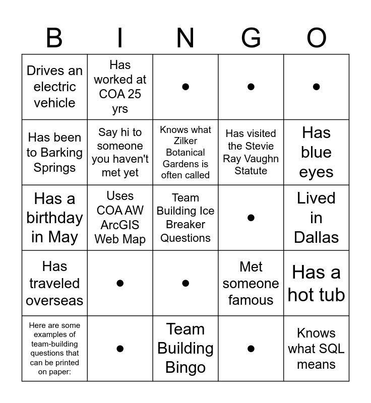 This bingo card has 45 words: Free!, Team Building Ice Breaker Questions, To use team-building questions from a printed paper, simply have team members individually answer each question on the paper, then share their answers with the group or in smaller subgroups for discussion. Alternatively, you can have teams colla, Here are some examples of team-building questions that can be printed on paper:, Icebreakers & Lighthearted Questions:, •, •, •, •, •, •, •, •, •, Team Building Bingo – GIS/IT Edition, Team Building Bingo, Has a tattoo, Has a birthday in May, Does not like pizza, Has blue eyes, Has worked at COA 25 yrs, Has on tennis shoes today, Has a cat and a dog, Drives an electric vehicle, Has visited Oklahoma, Lived in Dallas, Expert in Power BI, Is Left-Handed, Met someone famous, Has traveled overseas, Forget to put yourself on mute, Has a hot tub, Is wearing earrings, Is afraid of spiders, Has broken a bone at least once, Uses COA AW ArcGIS Web Map, Likes hot Cheetos, Familiar with COA HxGn EAM Software, Knows what SQL means, Knows what Zilker Botanical Gardens is often called, Has been to Barking Springs, Has visited the Stevie Ray Vaughn Statute, Has been to a UT Longhorn football game, Say hi to someone you haven't met yet and Seen Willie Nelson in concert.