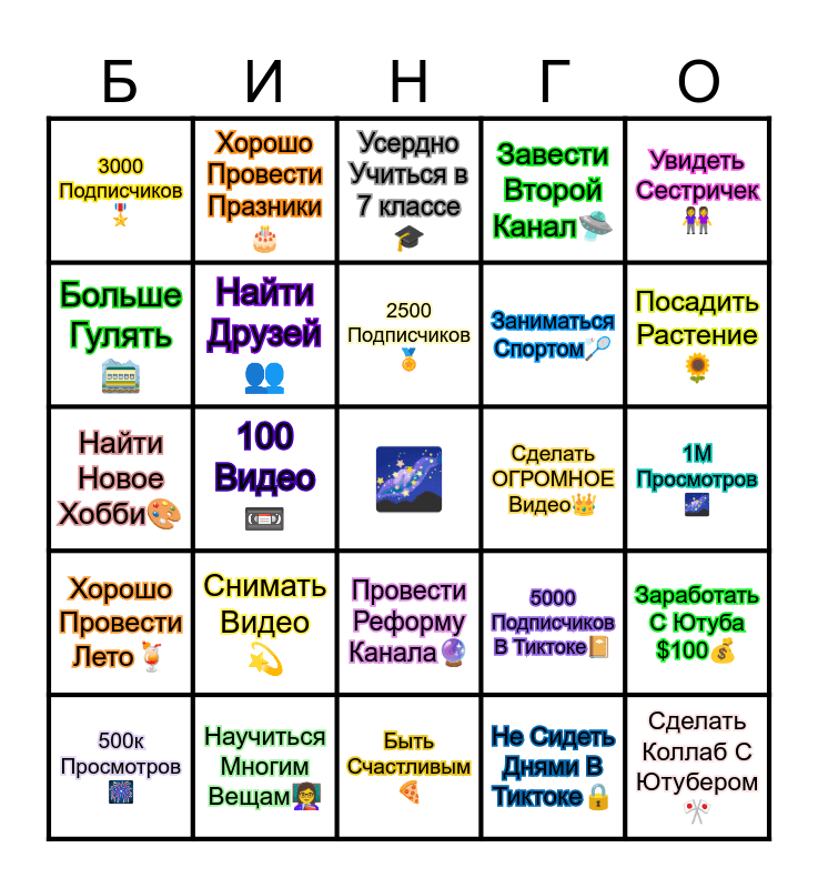This bingo card has a free space and 24 words: Снимать Видео💫, Научиться Многим Вещам👩🏫, 2500 Подписчиков🏅, 500к Просмотров🎆, Увидеть Сестричек👭, 3000 Подписчиков🎖️, Больше Гулять🚞, Хорошо Провести Празники🎂, Сделать ОГРОМНОЕ Видео👑, Провести Реформу Канала🔮, Заниматься Спортом🏸, Найти Новое Хобби🎨, 5000 Подписчиков В Тиктоке📔, Заработать С Ютуба $100💰, Найти Друзей👥, Не Сидеть Днями В Тиктоке🔒, 1М Просмотров 🌌, Усердно Учиться в 7 классе🎓, Посадить Растение🌻, 100 Видео📼, Сделать Коллаб С Ютубером🎌, Хорошо Провести Лето🍹, Завести Второй Канал🛸 and Быть Счастливым🍕.